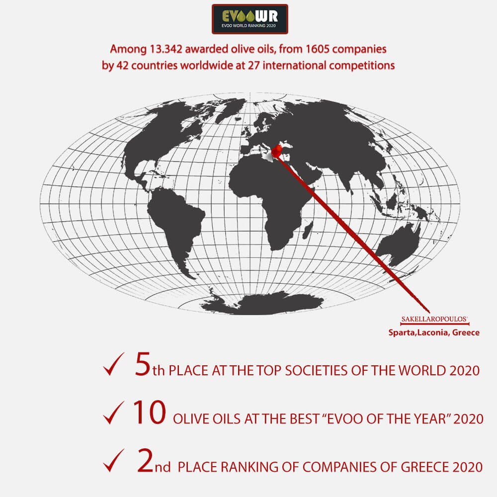 • 5th place in the world, among the best olive oil producing companies in the world for 2020 (TOP 10 and TOP 100 SOCIETIES OF THE WORLD 2020), among 1605 award-winning olive oil companies from 42 countries.