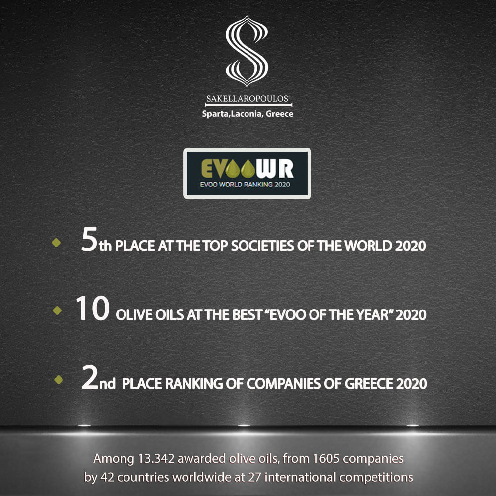 • Also, Sakellaropoulos organic farms ranked 2nd place for 2020, in the world ranking of Greek companies (Ranking of Companies Greece), for the second consecutive year, among 240 award-winning Greek companies that participated in the EVOO World Ranking 2020.The rare distinctions at the top ranks of the world ranking of EVOOWR 2020 are a huge reward for a Greek Single Estate and Terroir organic olive producer. At the same time our country, Greece and our land, Sparta Laconia, are promoted at the top of the world olive industry.