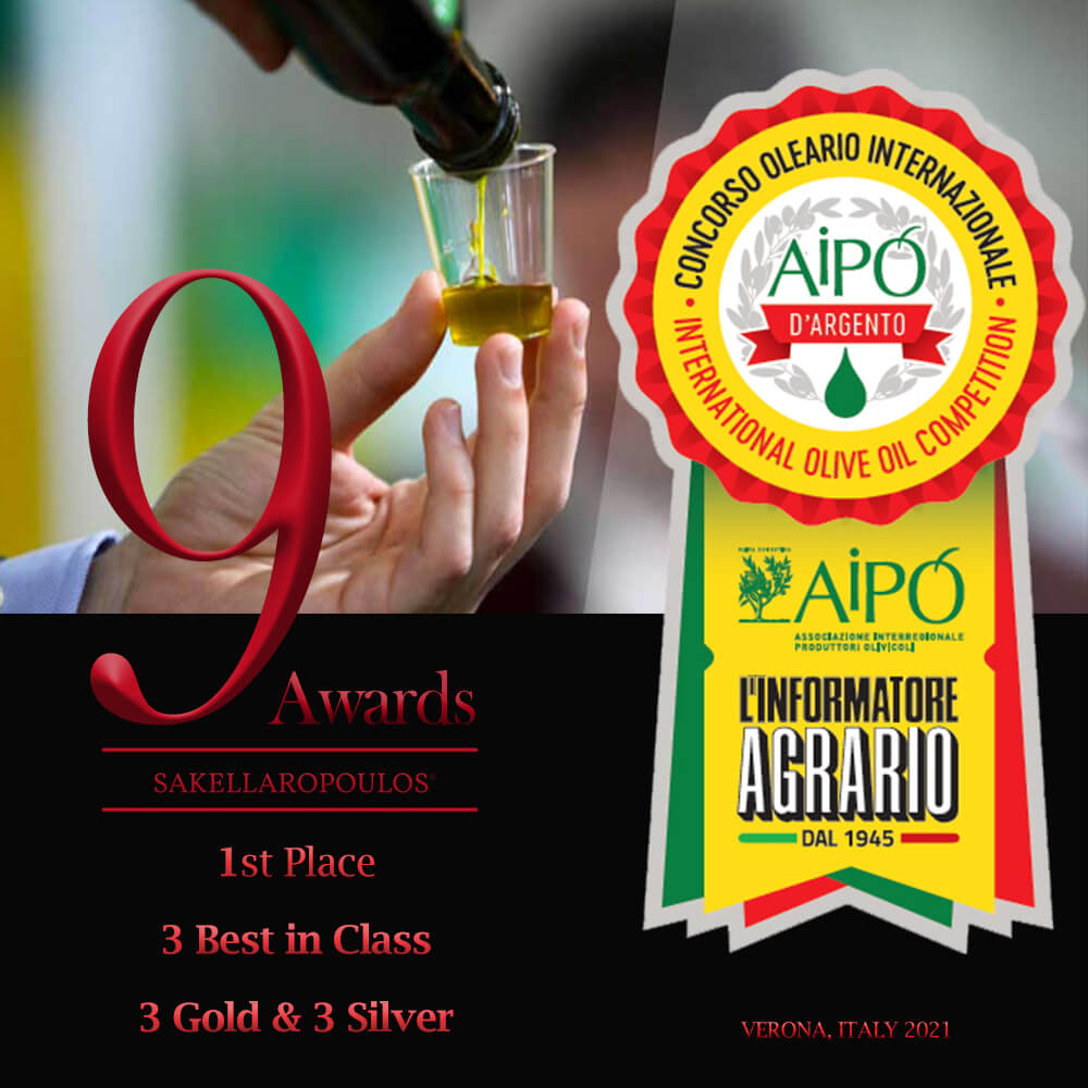 A unique distinction of very high prestige, with the 1st place and 9 awards in total, was marked in Verona, Italy, for Sakellaropoulos Organic Farms, in the recognized international olive oil competition Aipo d'Argento 2021.