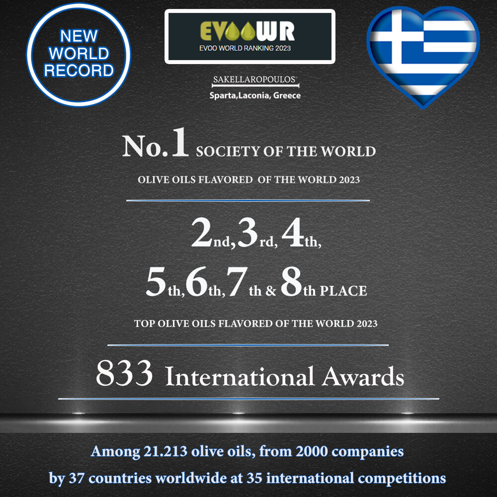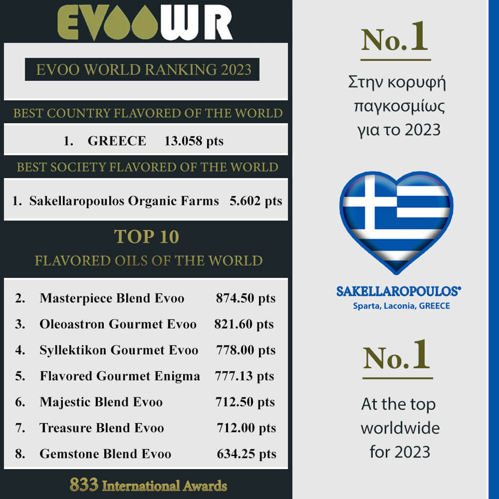 Additionally, with these high-level distinctions at a global level and among 21,213 olive oils from 37 countries around the world, included in the EVOO World Ranking 2023, the unique number of 833 international awards in recognized competitions of high prestige around the world is achieved by Sakellaropoulos Organic Farms.