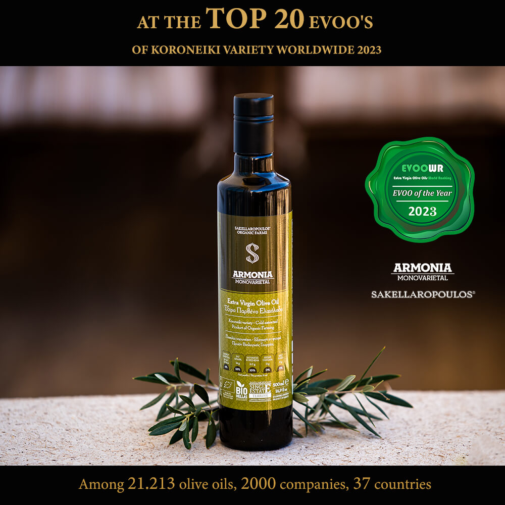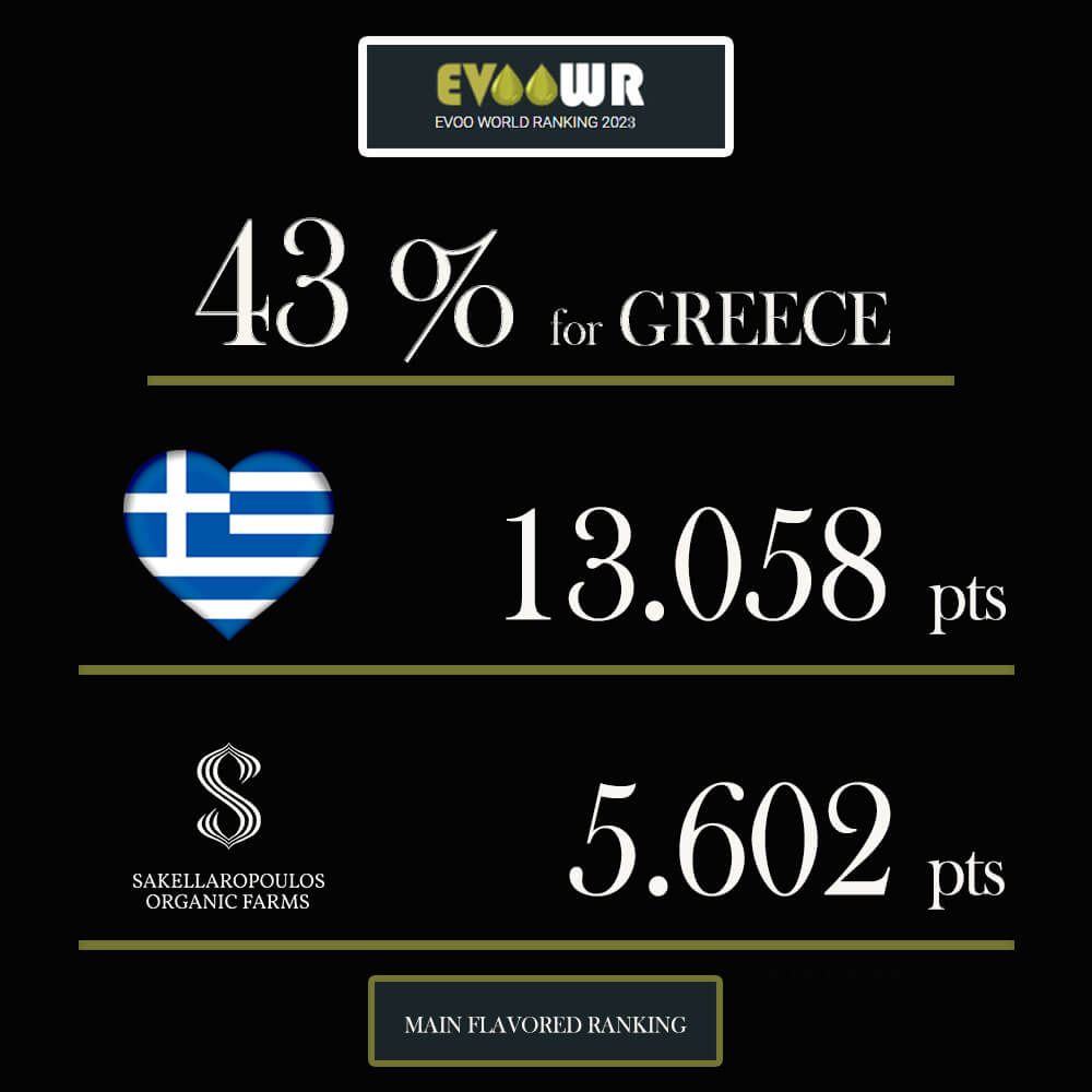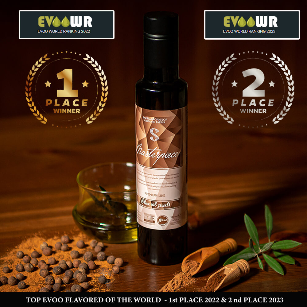 Futhermore, Sakellaropoulos Organic Farms, based on the global ranking EVOOWR 2023, are the No.1 company - producer of gourmet olive oils of Greece (Best Society Flavored Oil of Greece 2023), with their gourmet olive oil Masterpiece Blend Evoo being declared the best Greek gourmet olive oil of 2023 (Best Flavored Oil of Greece 2023), with a new record of points (874.50 pts).