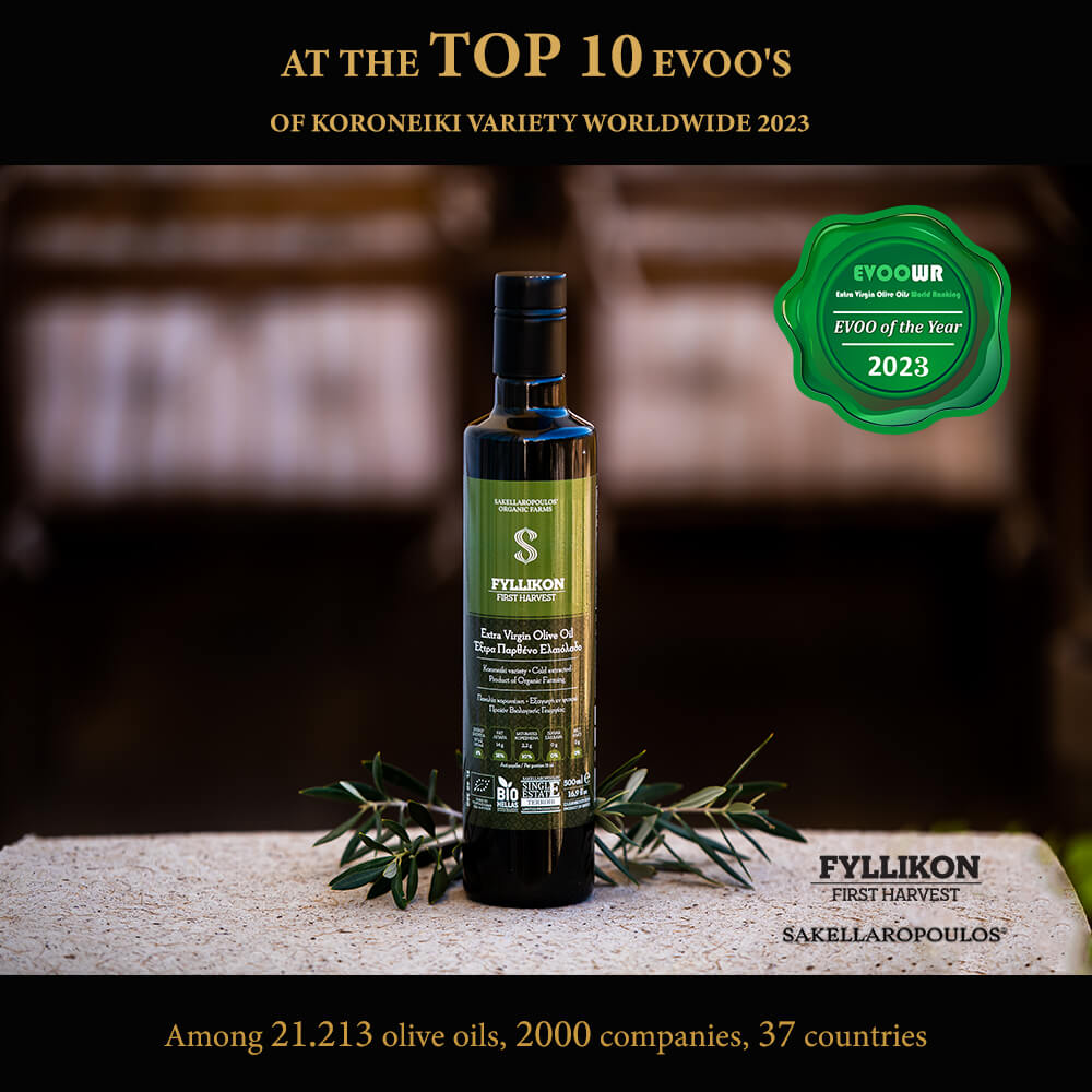 • The organic olive oil "Fyllikon First Harvest" was honored by being included in the TOP 10 of the best extra virgin olive oils of Koroneiki variety in the world, for 2023, while the organic olive oils "Agourelaio Early Harvest" and "Armonia Monovarietal" were honored by being included in the TOP 20 of the world's best extra virgin olive oils of Koroneiki variety, for 2023.