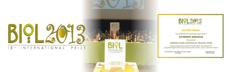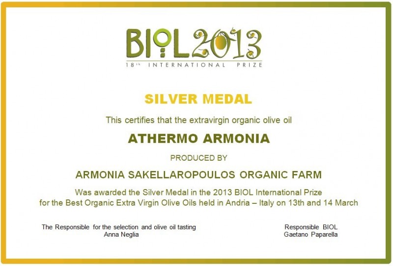 We would like to inform you that our product Organic Extra Virgin Olive Oil Armonia won the Silver Medal Award at the 18th International Organic Olive Oil Competition “BIOL International 2013” which took place in Andria, Italy, the 13th-15th of March 2013.