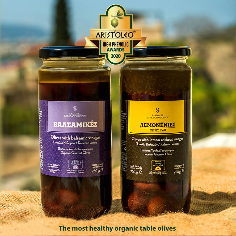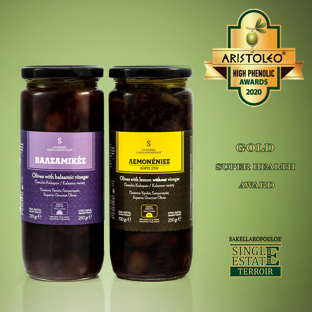 Μια μεγάλη διπλή τιμητική βράβευση για τους βιολογικούς ελαιώνες Σακελλαρόπουλου στα ARISTOLEO AWARDS 2020, για την υψηλότερη περιεκτικότητα φαινολών (υγειοπροστατευτικά συστατικά) στις επιτραπέζιες ελιές σε παγκόσμιο επίπεδο.