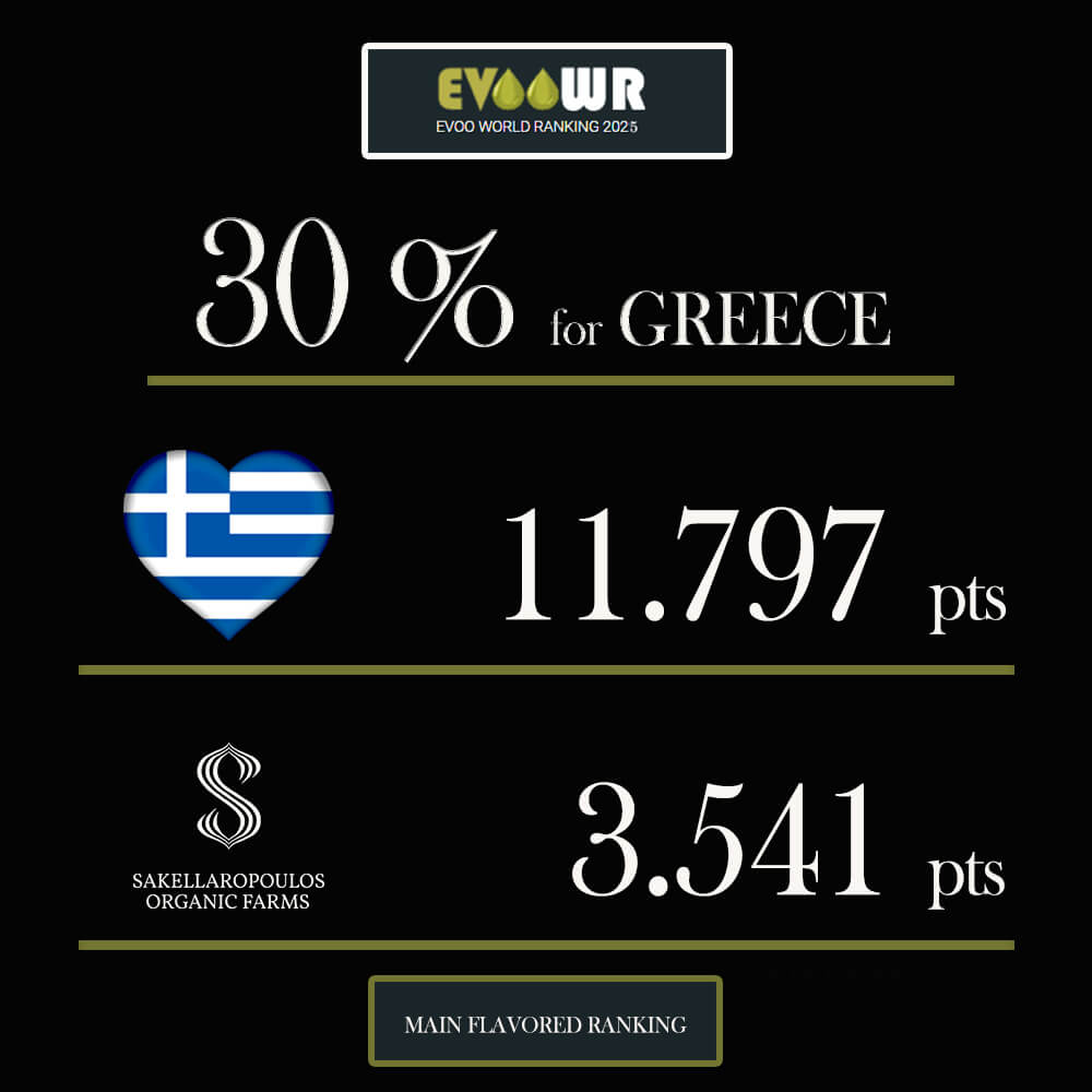 Ταυτόχρονα, οι βιολογικοί ελαιώνες Σακελλαρόπουλου αναδείχτηκαν νικητές και Νο.1 ελαιοπαραγωγός γαστρονομικών ελαιολάδων παγκοσμίως με 3.541 πόντους, συνεισφέροντας στην Ελλάδα ως ποσοστό το 30 % των πόντων της, ώστε να αναδειχθεί στην 1η θέση του κόσμου για το 2025, ενώ τιμήθηκαν ως η κορυφαία Ελληνική εταιρεία παραγωγός gourmet ελαιολάδων σε παγκόσμιο επίπεδο.