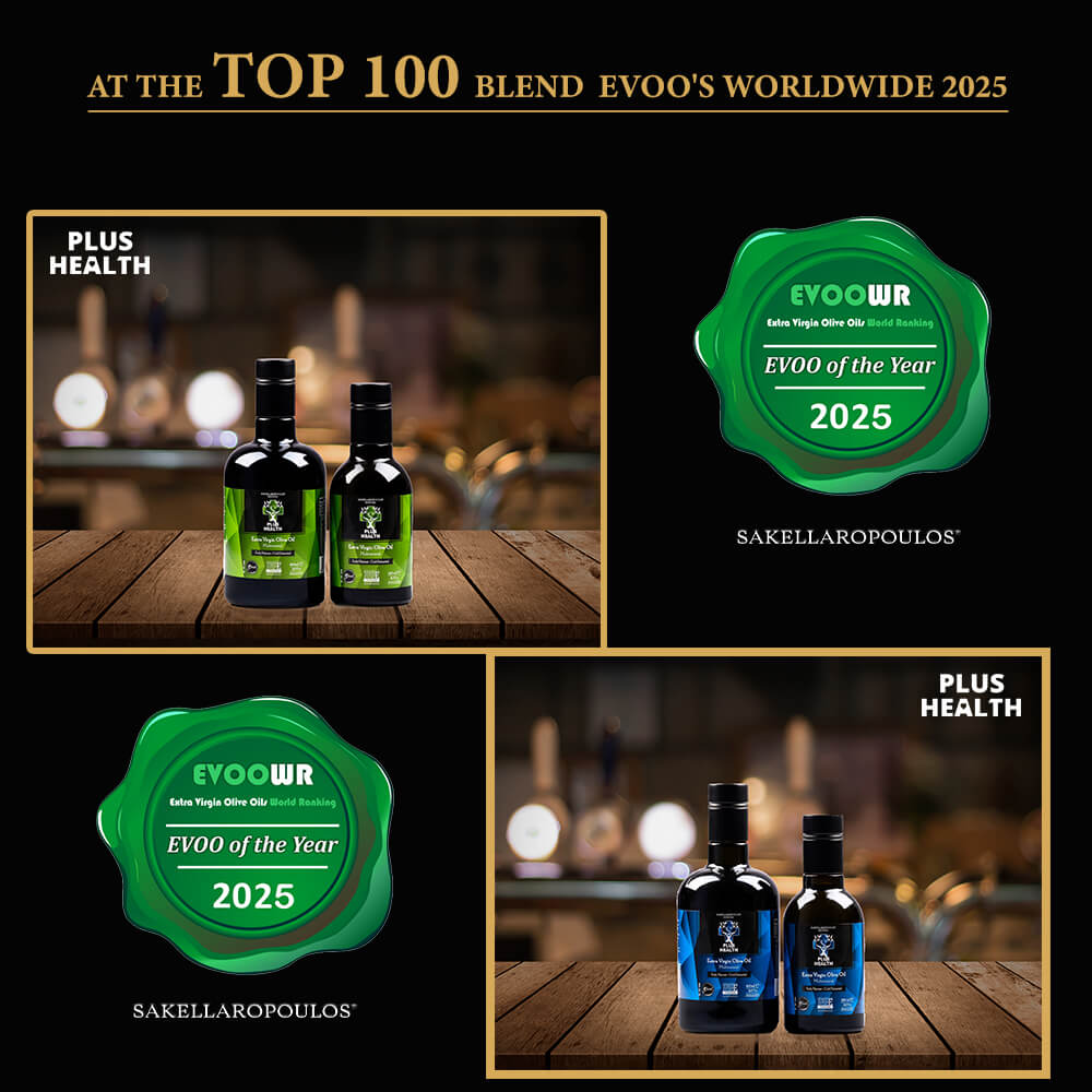 • Τα εξειδικευμένα πολυποικιλιακά ελαιόλαδα «Plus Health Multivarietal Green Evoo» και «Plus Health Multivarietal Blue Evoo» συμπεριλαμβάνονται στα TOP 100 καλύτερα πολυποικιλιακά (Blend) εξαιρετικά παρθένα ελαιόλαδα του κόσμου για το 2025, ανάμεσα σε 1.027 ελαιόλαδα της ίδιας κατηγορίας που διακρίθηκαν και βραβεύτηκαν στους 47 διεθνείς διαγωνισμούς του 2025, σε όλο τον κόσμο.
