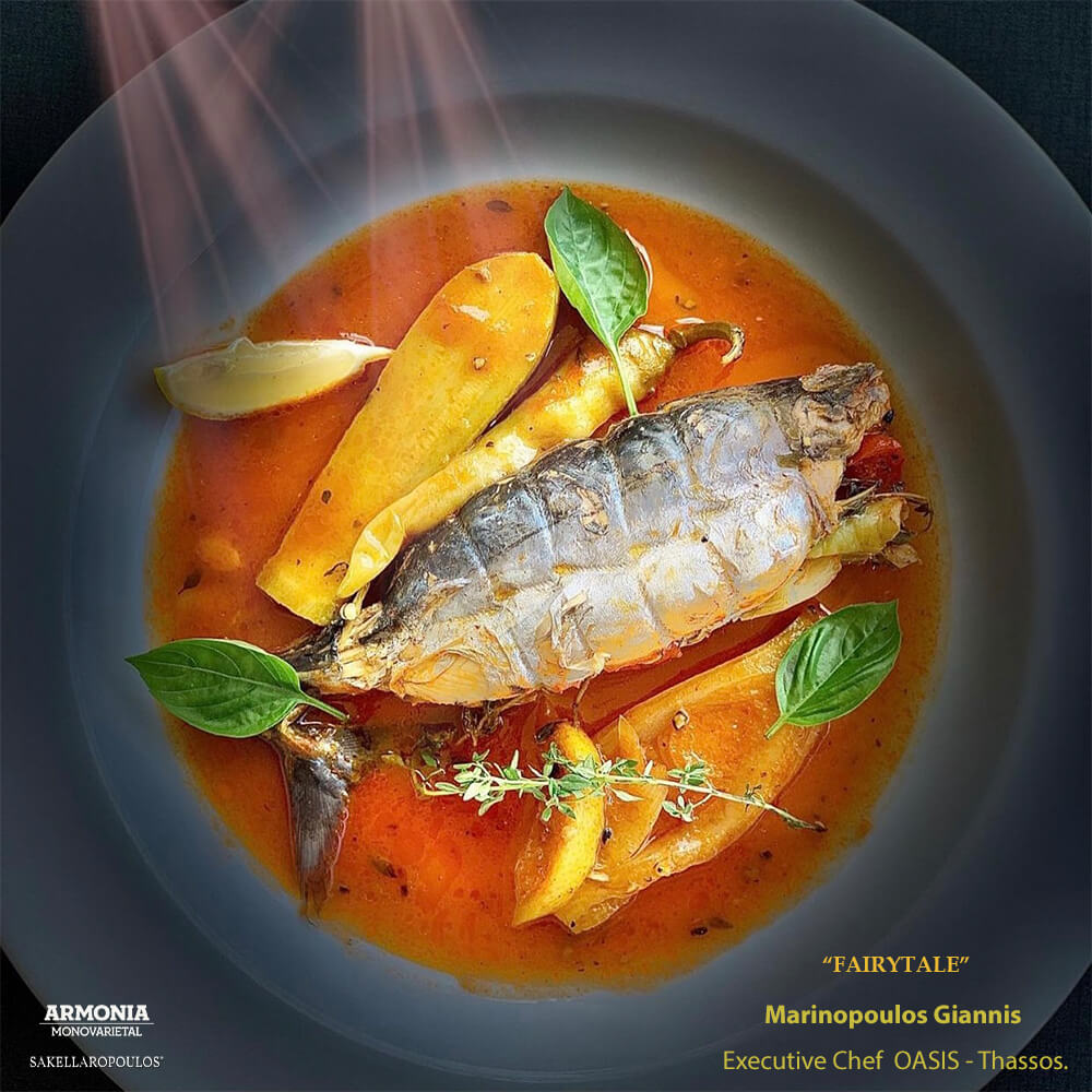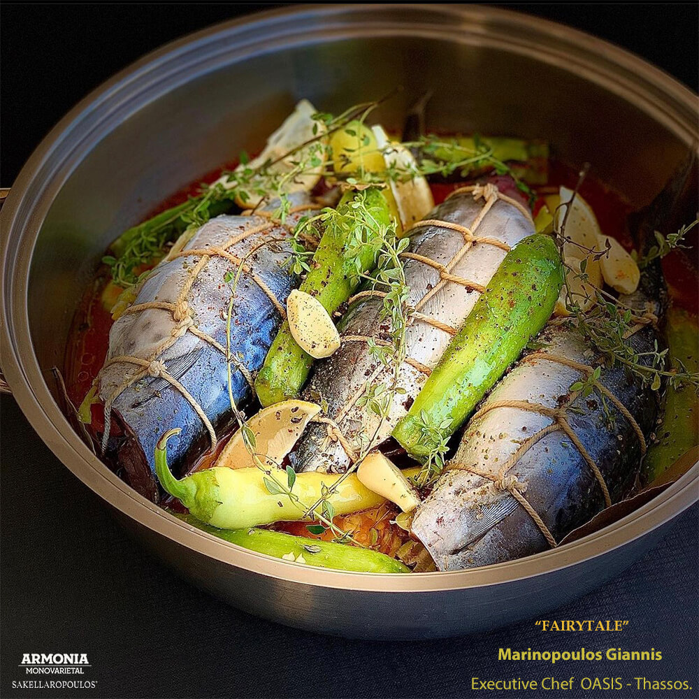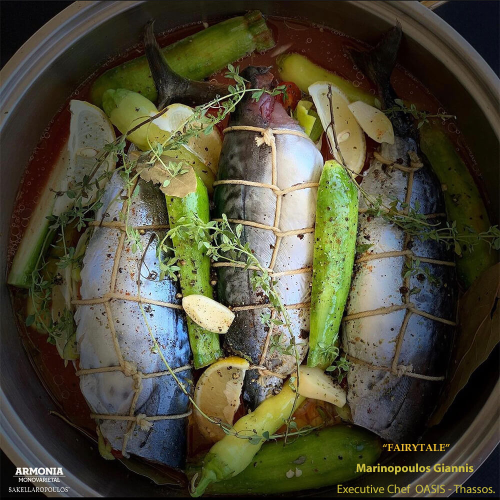 Αυγουστιάτικη παλαμίδα,γεμισμένη με μαραθοριζα, ολόφρεσκα λαχανικά του καλοκαιριού, φρέσκια ρίγανη και σάλτσα κακαβιάς, αρωματισμένα με βιολογικό μονοποικιλιακό ελαιόλαδο Αρμονία.
